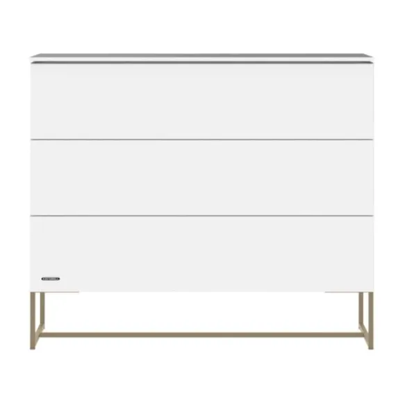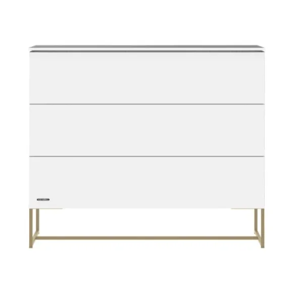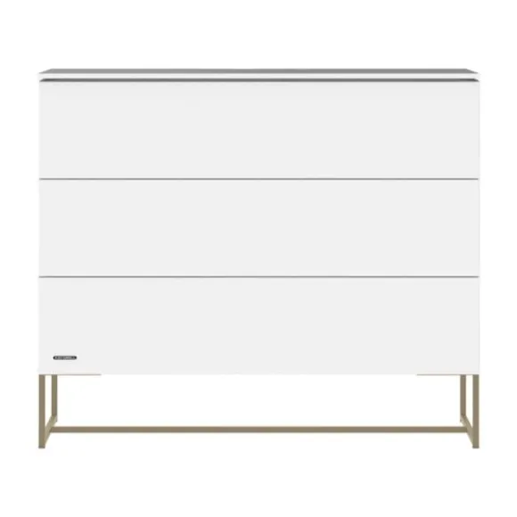 De Kidsmill Intense II Babykamer Wit / Patinated Brass is een moderne en stijlvolle 2-delige set met een luxe uitstraling. Het mat witte design in combinatie met het messingkleurige onderstel zorgt voor een rustige en elegante sfeer in de babykamer. Dankzij het tijdloze ontwerp past deze set perfect in elk interieur. Het ledikant (60 x 120 cm) is verstelbaar in drie hoogtes en biedt een veilige en comfortabele slaapomgeving voor je kindje. De commode is voorzien van drie ruime lades met een push-to-open systeem en biedt voldoende opbergruimte voor kleertjes en verzorgingsspullen. Praktisch in gebruik én een echte eyecatcher.