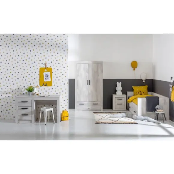 De Kinderkamer Sem Nautic Grijs bestaat uit een bedbank met lade van 90×200 cm en een praktisch bureau met drie opbergladen. Hier kan je kindje mee vooruit! Het bureau is een prettige werkplek en een opbergruimte ineen. De hoogte en afmetingen zijn zo op elkaar afgestemd dat je kindje elke dag weer comfortabel achter het bureau kan zitten. De meubels zijn gemaakt van hoogwaardig en stevig materiaal en gaan jaren mee.