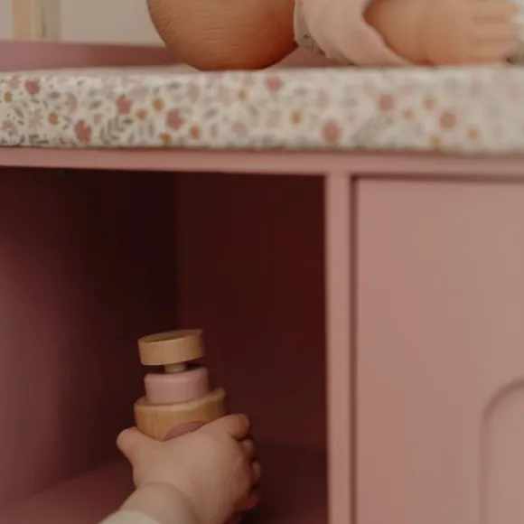 De commode is uitgerust met praktische schapjes en een kastje waarin verzorgingsspulletjes netjes opgeborgen kunnen worden. Zo blijft alles overzichtelijk en binnen handbereik. De roze kleur gecombineerd met natuurlijke houtaccenten geeft het meubel een warme, speelse uitstraling die perfect aansluit bij andere Little Dutch poppenaccessoires.