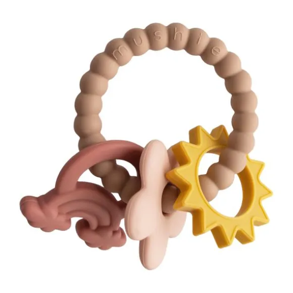 De Mushie Teething Ring – Nature is speciaal ontworpen om je kleintje comfort en plezier te bieden tijdens het doorkomen van de tandjes. Met zijn speelse vormen en zachte texturen nodigt deze bijtring je baby uit om te ontdekken en te verkennen. Het verhoogde bladoppervlak masseert het tandvlees op een zachte manier, terwijl de drie charmante bedels in de vorm van een zon, regenboog en madelief de zintuigen stimuleren. Dit maakt het niet alleen een praktische keuze, maar ook een leuke speelervaring voor je kindje.