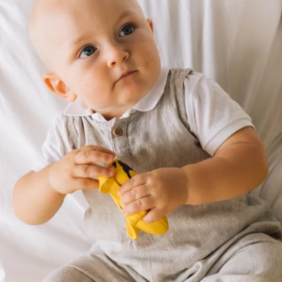 De Oli & Carol Ana Banana is een vrolijk en veilig bijtspeeltje voor baby’s. Gemaakt van 100% natuurlijk rubber en vrij van BPA, PVC en ftalaten. Het ontwerp zonder gaten voorkomt schimmelvorming, terwijl de zachte structuur perfect is voor doorkomende tandjes. Het compacte formaat en speelse design stimuleren de zintuigen en maken het makkelijk vast te houden voor kleine handjes. Ideaal als bijt- of badspeeltje!
