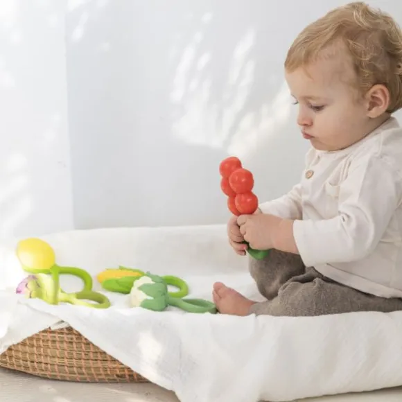 De Oli & Carol Rammelaar – Tomaat is een 2-in-1 bijtspeeltje en rammelaar, gemaakt van 100% natuurlijk rubber en gevuld met gerecyclede kersenpitten. Het zachte materiaal is veilig voor doorkomende tandjes en stimuleert de zintuigen van je kindje. Ontwikkeld met KNO-artsen voor een rustgevend geluid dat kalmeert zonder te overstimuleren. Dankzij het ronde ontwerp is de rammelaar gemakkelijk vast te houden en mee te nemen. Vrij van plastic, gaatjes en schadelijke stoffen: veilig en hygiënisch!