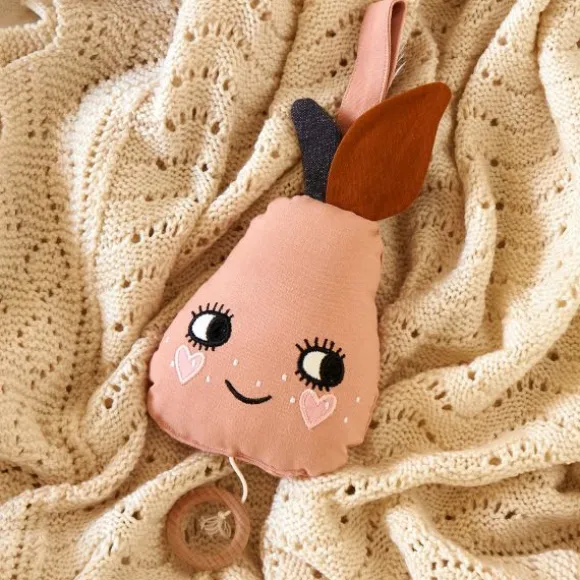 De Roommate Muziekmobiel – Pear is een vrolijke toevoeging aan elke babykamer. Deze schattige peer met geborduurd gezichtje speelt een rustgevend slaapliedje van Johannes Brahms zodra je aan het houten ringetje trekt. Perfect om je kleintje te helpen ontspannen en in slaap te vallen. Gemaakt van 100% biologisch katoen met een zachte polyester vulling, voelt de mobiel heerlijk aan en is hij volledig babyproof. Dankzij het lusje hang je hem eenvoudig aan het ledikantje, de box of aan de wand. De stijlvolle kleuren maken hem bovendien tot een echte eyecatcher in de kinderkamer.