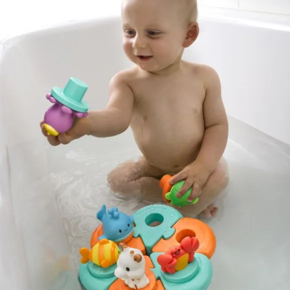 De Sophie de Giraf Badpuzzel maakt van elke badtijd een feest! Kinderen vanaf 10 maanden kunnen spelen met zes kleurrijke spuitfiguurtjes, waaronder Sophie, een walvis, schildpad en meer. De puzzelstukken vormen samen een drijvend speelplateau dat de fantasie en motoriek stimuleert.De figuurtjes spuiten water bij het knijpen en zijn makkelijk vast te houden dankzij de afgeronde vormen. Perfect voor kleine handjes en volop speelplezier in bad. Deze badpuzzel is niet alleen leuk, maar ook leerzaam en ideaal als cadeau.