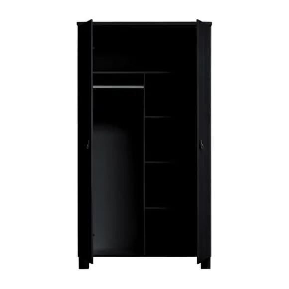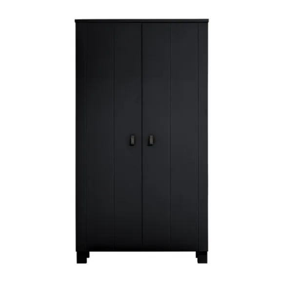 De Woood Ties Kledingkast Zwart 2-Deurs is een meubel in een stoere look. Deze uitstraling komt door de kleur en door het robuust design. In de fronten van de deuren bevind er reliëfstructuur wat de finishing touch geeft aan dit meubel. De deuren zijn verder eenvoudig open te doen door middel van de lederen handgrepen op de fronten. Verder heeft deze kledingkast een praktische indeling van een roede en legplanken.
